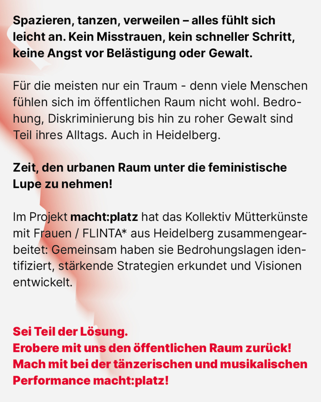 macht:platz kreiert neue Räume, indem wir Angsträume, die bereits existieren, bearbeiten und neu besetzen. Die Künstlerinnen laden zum Träumen ein von einer Stadt, in der einem großen Teil der Bevölkerung nicht länger Wege oder Flächen aufgrund von Bedrohung(sgefühlen) verwehrt bleiben. Sie erschaffen einen urbanen Raum, in dem Frauen/FLINTA* einen nächtlichen Spaziergang genießen können.